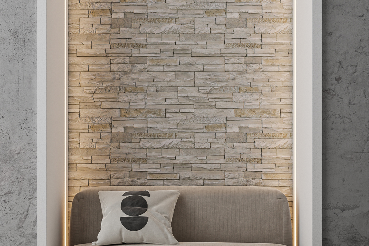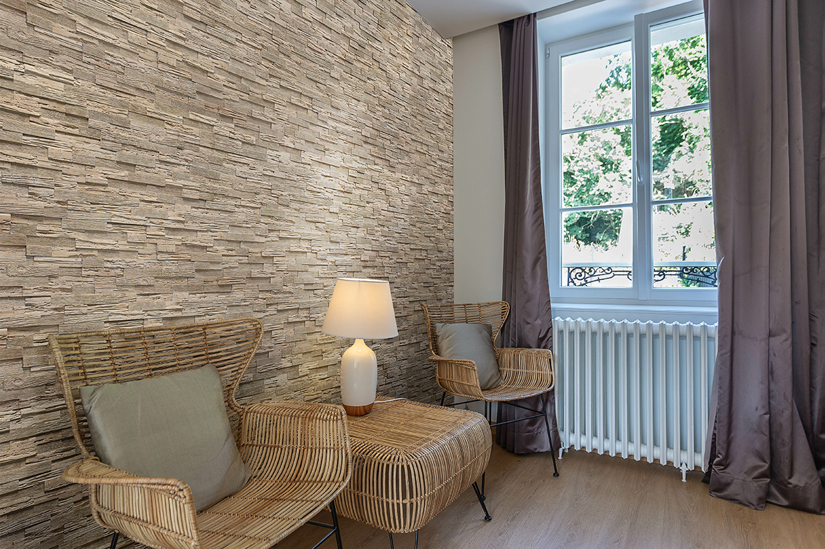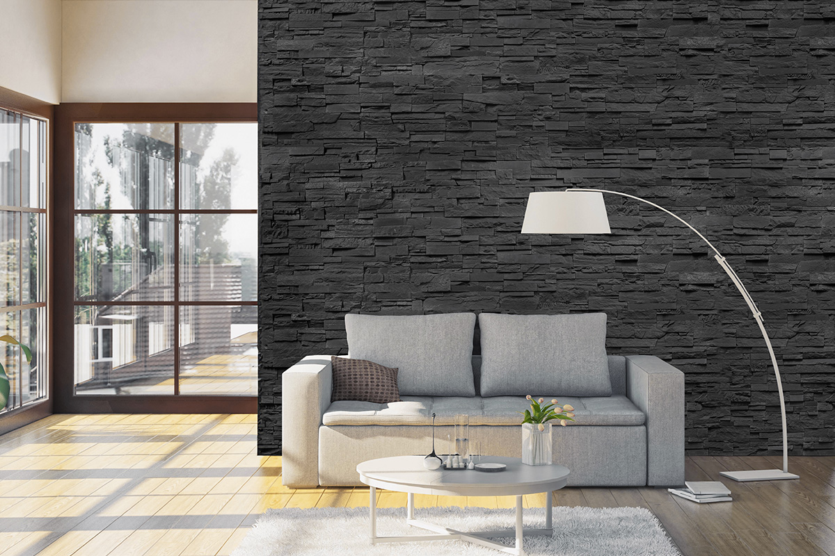 - Adaugă textură și profunzime: în loc de pereți simpli vopsiți, avem textura unei placări cu piatră decorativă