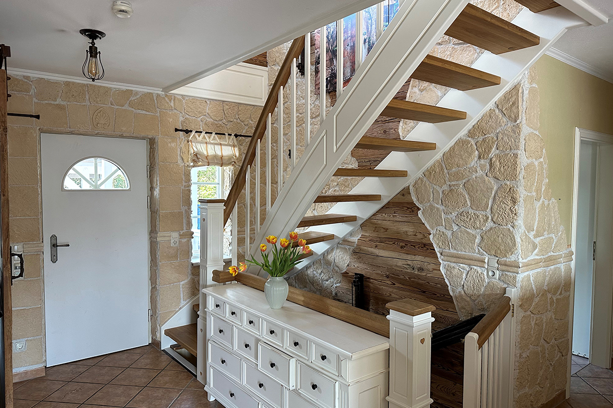 Cote Mur reușește să creeze un fundal rafinat pentru spațiile de trecere, cum sunt holurile sau scările interioare. Combinația dintre piatra decorativă și lemnul cald, așa cum se vede adesea în pardoseli sau trepte, redă atmosfera caselor din Provența, unde fiecare detaliu transmite confort și eleganță rustică.