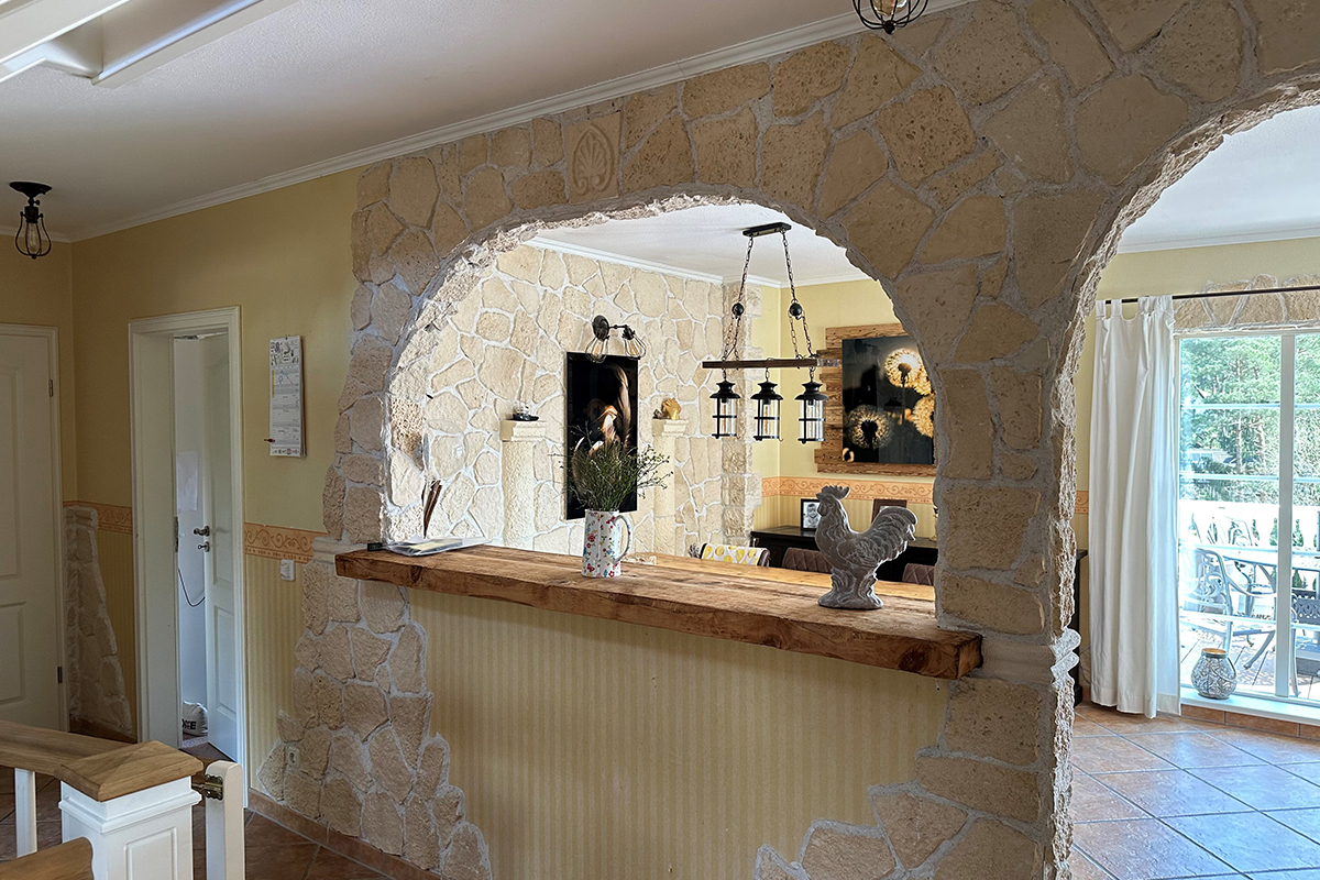 Dacă exteriorul unei case French Country cucerește prin fațade din piatră decorativă și detalii arhitecturale armonioase, interiorul aduce același farmec rustic elegant într-o atmosferă luminoasă și primitoare. Piatra decorativă la interior joacă un rol central, completând mobilierul alb sau pastel și accentele din lemn masiv.